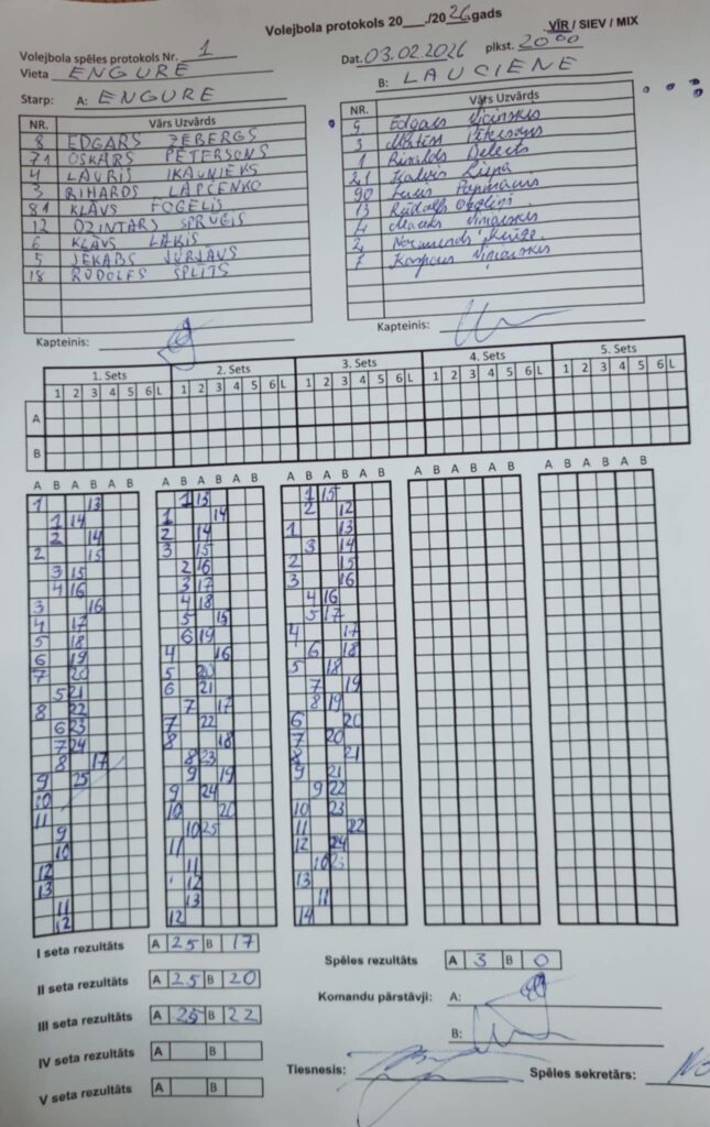 3.februāra vakarā aizvadīta vīriešu volejbola čempionāta spēle Engures vidusskolas sporta zālē, kur mājinieki – Engure – uzņēma šā brīža Tukuma novada vīriešu volejbola čempionāta līderus – SK Lauciene komandu!