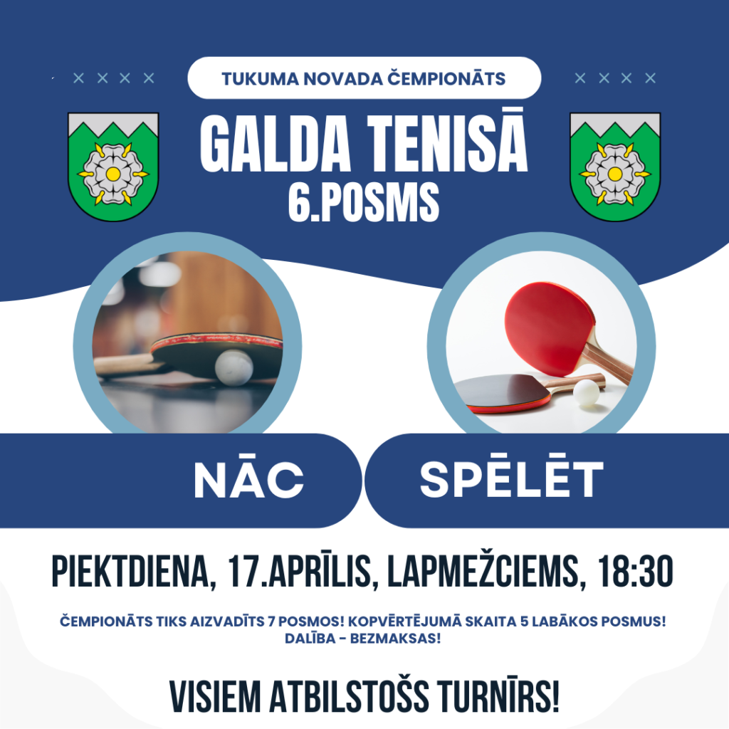 18:30 - 21:00 Tukuma novada galda tenisa čempionāta 6.posms 17 aprīlis @ 18:30 - 21:00 Tukuma novada galda tenisa čempionāta 6.posms