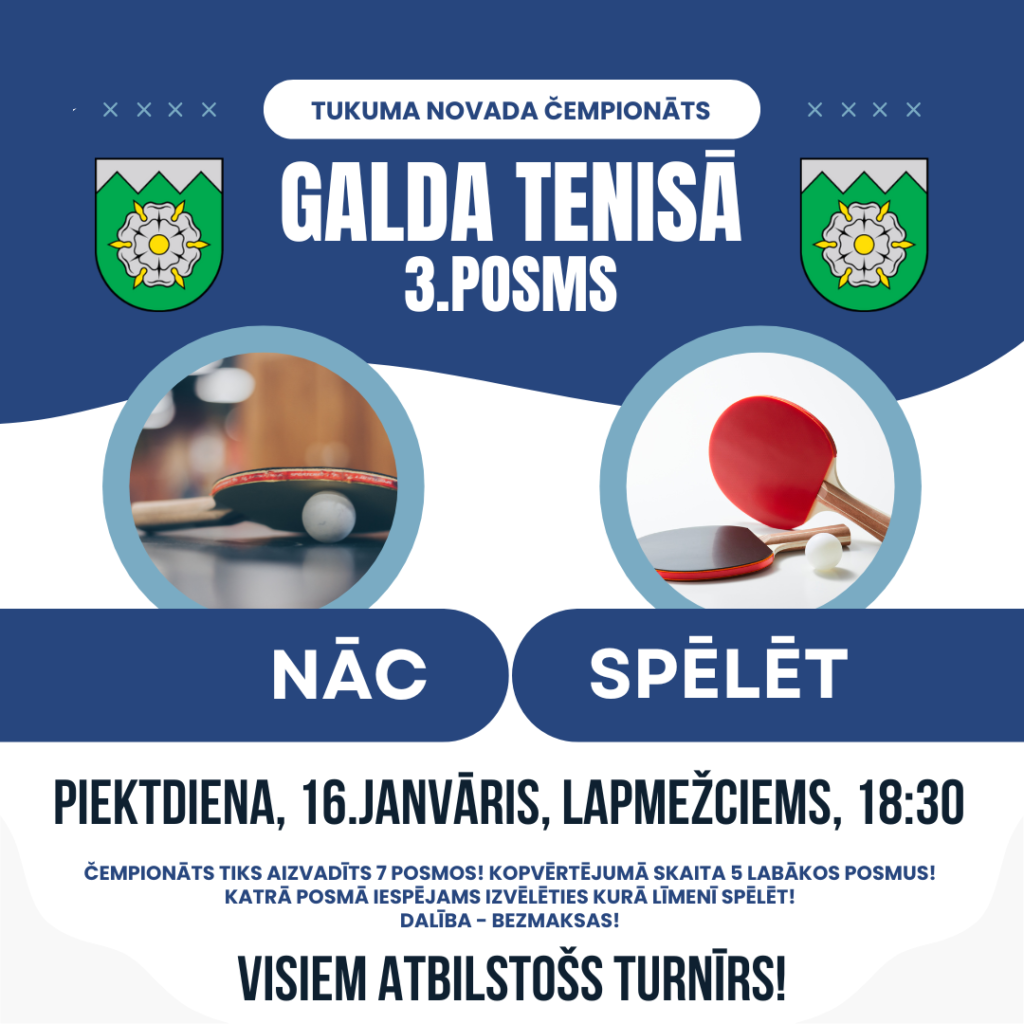 18:30 - 21:00 Tukuma novada galda tenisa čempionāta 3.posms 16 janvāris @ 18:30 - 21:00 Tukuma novada galda tenisa čempionāta 3.posms