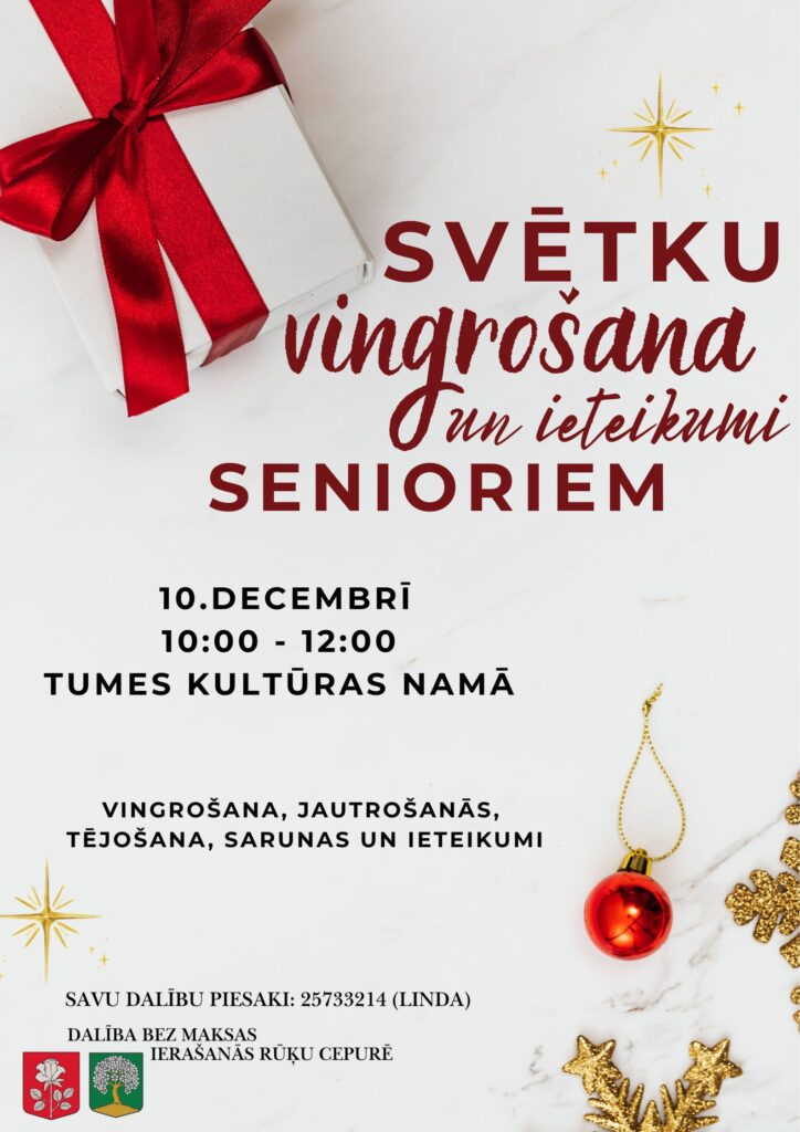 10.decembrī plkst.10:00 notiks šī gada noslēdzošā vingrošana, kuras laikā ne tikai vingrosim, bet arī būsim kopā jautrojoties, malkojot tēju. Pasākums ir bez maksas. Lūgums ierasties rūķu cepurēs, lai kopīgi radītu svētku noskaņojumu! Savu dalību pasākumam piesaki pa tel.nr. 25733214 (Linda) Pasākuma laikā tiek veikta fotogrāfēšana un filmēšana. Iegūtie materiāli tiks izmantoti pasākuma atspoguļošanai un popularizēšanai Lasīt tālāk