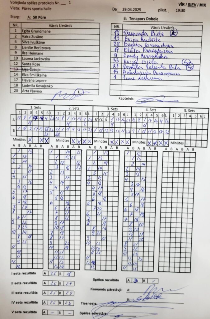SK Pūre – Tenapors Dobele 3:1 (25:18; 25:27; 25:20; 25:23). Sērijā 2:1!