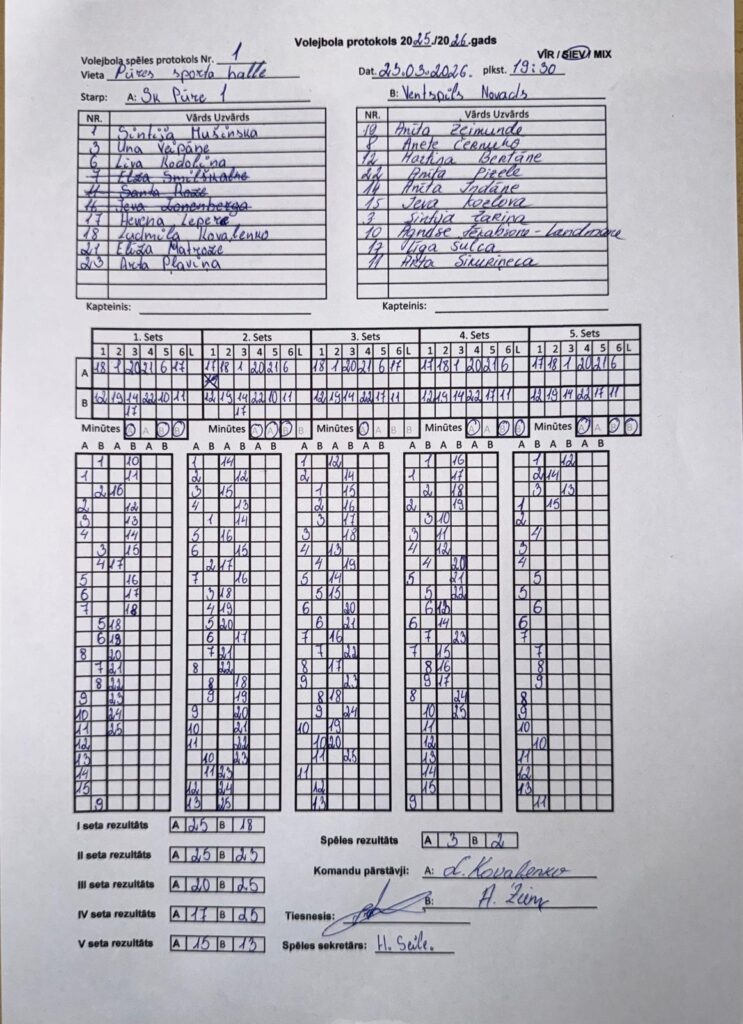 SK Pūre 1 – Ventspils novads 3:2 (25:18; 25:23; 20:25; 17:25; 15:13). Sērijā 1:0!