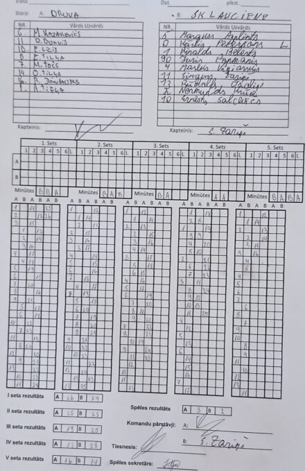 VK Druva – SK Lauciene 3:2 (26:24; 25:23; 19:25; 13:25; 16:14). Sērijā 1:1!